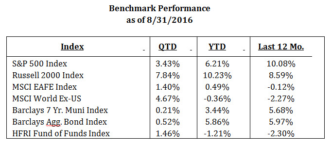 As we move towards the fourth quarter of 2016, we see a number of market influencing factors on the horizon. The upcoming Fed meeting, the presidential election, earnings season and the initiation of Brexit negotiations are at the forefront. Within equities we continue to favor domestic exposure, but stand against the crowd by not reducing our international exposure. Within Fixed Income, we continue to favor high quality municipal and intermediate corporate exposure. As always, please do not hesitate to reach out directly to discuss any of the above mentioned information or the impact on your portfolio’s positioning.