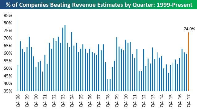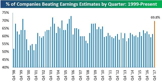 The chart below from our friends at Bespoke Investment Group give a good visual of the earnings strength we have experienced so far this season. As shown below, both the earnings and revenue beat rates this season are at their highest levels in at least a decade.