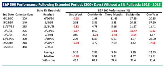 Another interesting chart (below) from Bespoke Investment Group shows the S&P 500’s performance following the date when each of the prior extend periods without a 3% pull back have been broken. It appears that on average, investors have experienced good “bounce back” returns over the following one, three, six and twelve months.