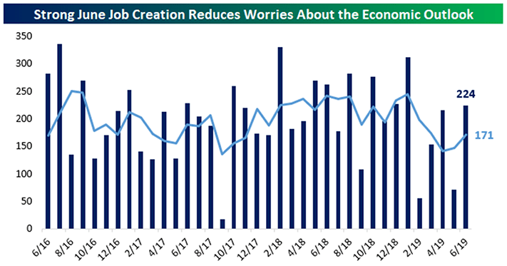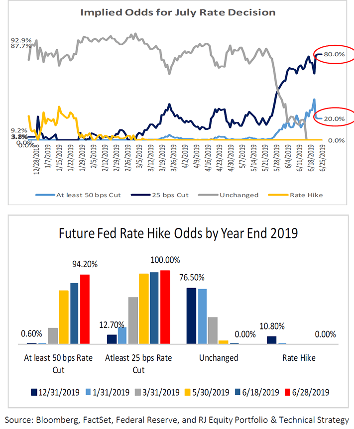 Clearly the elevated expectations of a rate cut make the July FOMC meeting pivotal to the short-term direction of the markets. Should the Fed disappoint investors and hold rates steady, we find it likely that a period of consolidation in the equity markets could follow. Conversely, if the Fed were to surprise at the upside with a .50% rate cut, we would expect to see markets respond positively and potentially set the stage for new all-time highs to be reached before year end.