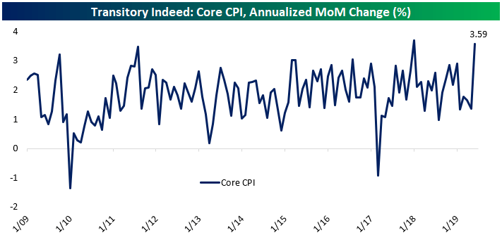 However, very recent data has muddied the waters somewhat for the FOMC. June Core CPI rose 3.6% annualized, the second largest month over month advance for core prices during this economic expansion. This upside surprise confuses the outlook for the Fed in our opinion, as the focus on below target inflation being transitory or persistent is likely to pick back up.