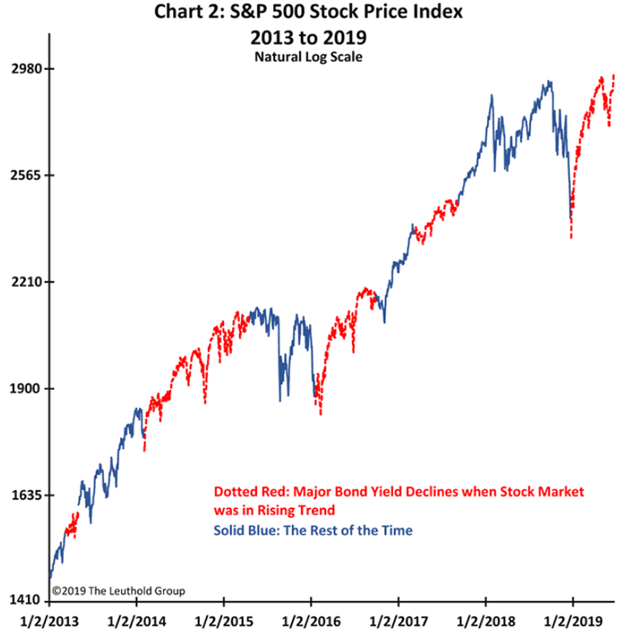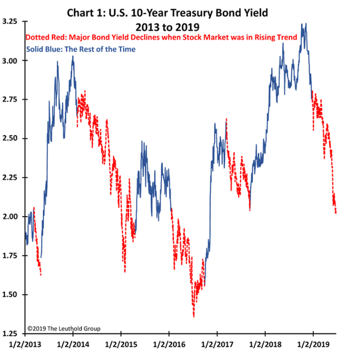 While US equites moved significantly higher in the first half of 2019, US bond yields have been trending lower for most of the year. This divergent action implies that the stock market is optimistic about the future of the economic cycle and recovery, while the bond market appears increasingly skeptical. It begs the age-old question, what does the bond market know that the stock market doesn’t? Are equity investors too optimistic and discounting the risks of the trade war negotiations, possible recession or other calamity? Perhaps, but when digging a little deeper one finds that it has not been uncommon during this recovery for equity prices and bond yields to diverge. In fact, it has been rather common, this is the fifth time since 2013 that we have seen the ten-year treasury yield decline in the face of a rising stock market.