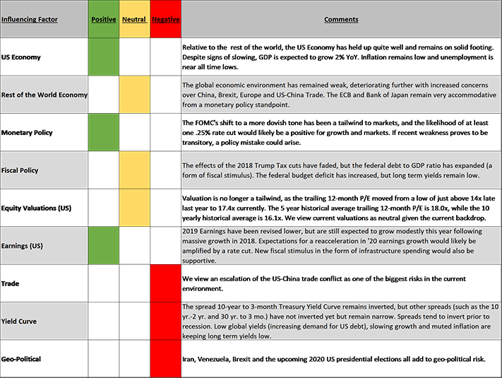 While we remain constructive in the long term, we view short term risks as elevated and worthy of patient attention. With US equities at all-time highs, bond yields near all-time lows and impactful policy decisions on interest rates and trade in the offing, we feel content with our neutral view and feel confident that our current portfolios allocations position us appropriately for near term, whether that includes upside or downside surprises.