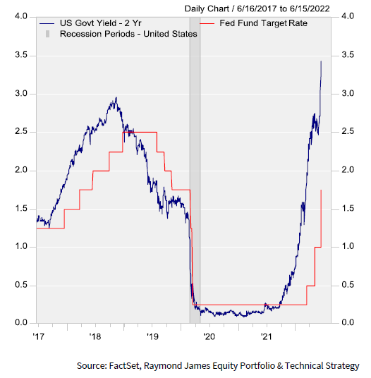 Last week’s higher than expected CPI reading spurred the Fed to pivot quickly and raise the Fed Funds rate by .75% (more than the originally anticipated .50%). Currently, the market expectation is for another .75% increase in July, pushing the upper end of the Fed target rate to 2.5%. Now the Fed faces a challenging task; be hawkish enough to temper inflation but agile enough to not over tighten. Historically, the 2-year Treasury yield has been a particularly good indicator of where the Fed is headed. Currently at 3.19%, the Fed is quickly playing catch up to where the bond market believes the Fed needs to go with rates.
