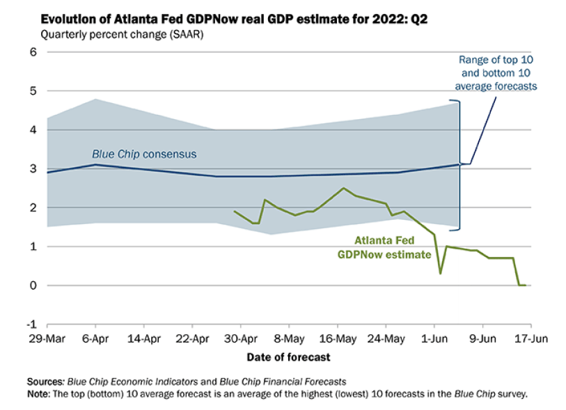 The consensus seems to be that recession is unlikely in the near term, with most economists projecting a potential recession sometime in 2023. However, we have already seen one negative GDP print and given the current backdrop it is entirely possible that we see another negative print at the end of the quarter. In other words, it would be naïve to dismiss the possibility that we are already in a technical recession (which would be the second in the last two years). In fact, the Atlanta Fed’s GDPNow model shows a significant divergence from the average forecast.
