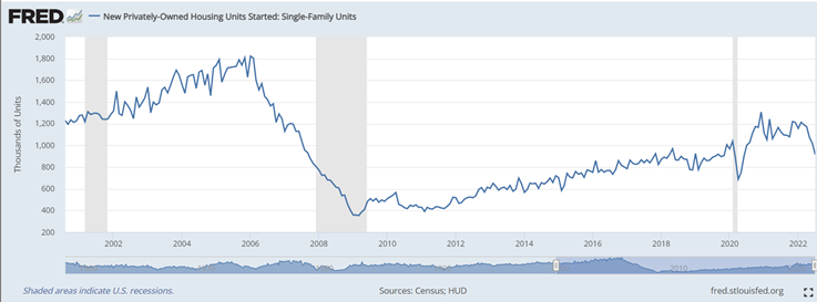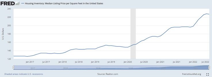 Since The Great Recession of 07’-08’ single-family home builds have been below historical averages causing both housing shortages and increased prices for both homes and rent. Since 2017, we have seen a near doubling of the cost per square foot for homes making housing affordability very difficult for middle-income Americans. In turn, this could create a feedback loop of unaffordable housing that perpetuates higher rent costs from increased rent demand. If higher interest rates cannot materially bring down home prices, then there becomes an ever-increasing renters’ class that will be at the mercy of landlord price increases thus supporting higher future inflation prints within OER.