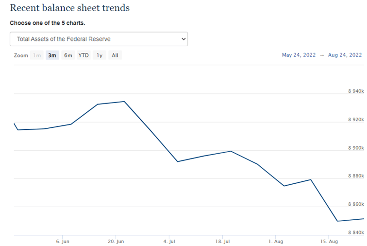 “The Fed plans to reduce its $8.5 trillion balance sheet beginning June 1, when it will no longer reinvest proceeds of up to $30 billion in maturing Treasury securities and up to $17.5 billion in maturing agency mortgage-backed securities per month. Beginning September 1, those caps will rise to $60 billion and $35 billion, respectively, for a maximum potential monthly balance sheet roll-off of $95 billion.”3 Based on Powell’s eight-minute speech at Jackson Hole on the importance of price stability and the need to continue to tighten conditions to combat inflation, it would be expected that the June 1st plan would have been followed accordingly, however, the chart below says otherwise. In the last three months, the Federal Reserve has reduced its balance sheet by a total of approximately $63 billion – well below the expected $47.5 billion monthly reduction that should have taken place in each of the last three months.