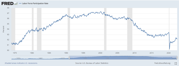 Going hand-in-hand with Fed Policy is the continued labor shortages and wage inflation problems seen in the last year. The excess stimulus has ushered in the great resignation and given employees the upper hand in negotiating higher salaries with approximately 1.9 jobs per unemployed person in America. These shifts are unlikely to reverse in the near term. Workers over 55 continue to retire prematurely and the average worker remains challenged by a rising cost of living. With a higher cost of goods and insurmountable home prices, we may see ongoing weakness in employee participation rates, as shown in the labor participation rate chart below.