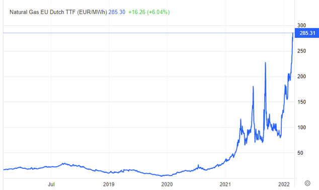 Directly related to the Ukraine/Russia conflict, the energy crisis continues throughout Europe, hitting countries like Germany incredibly hard. Natural gas and oil prices have gone completely parabolic since 2021, as shown in the graph below. Although the U.S. has more energy independence than Europe, this most certainly brings a negative spillover effect domestically especially if there’s an increased need for the U.S. to export to European countries.