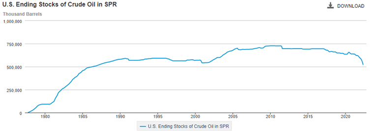 Current U.S. oil drilling efforts – proxied by looking at the online oil drilling rig count, have climbed since the pandemic but are well under pre-pandemic levels. Furthermore, U.S. strategic reserves have been depleted by over 100 million barrels, equal to five days of domestic use since 2020, with the most recent figure putting us at the lowest levels in over thirty-five years. Additionally, OPEC+ recently lowered output projections, reversing course from the increase following President Biden’s visit to Saudi Arabia.