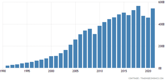 China-Taiwan relations continue to devolve as headlines report Chinese military drills near the shores of Taiwan and countermeasures taken by Taiwan with their recent takedown of a Chinese drone. This increasing tension puts the U.S. in a precarious position as Taiwan is responsible for 56% of global microchip manufacturing. If China were to take control of Taiwan, this could disrupt supply chains. The U.S. is combating this risk with the bipartisan bill passed in July called the CHIPS act which will fund $52 billion toward onshoring microchip production in the U.S. However, this pivot in U.S. foreign trade reliance could be the start of increasing hostility from China as we continue to reduce our overall trade reliance with them. The chart below shows our annual Chinese trade imports– still below 2018 highs.