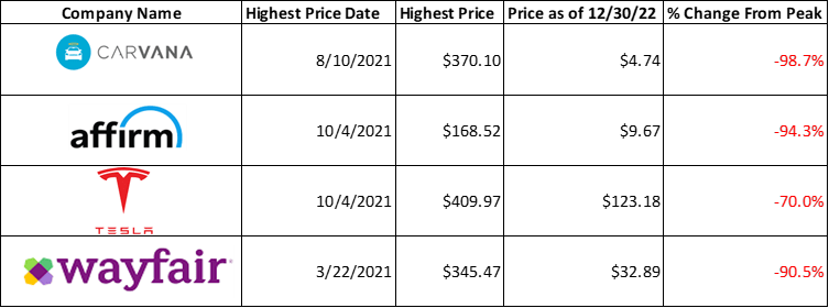The equity markets suffered in 2022 as the Federal Reserve aggressively tightened monetary policy, causing seismic moves up in U.S. interest rates. This caused market fears of slowing consumption and thus concerns over reduced economic growth. One of the hardest hit indexes was the NASDAQ which fell -32.5% on the year. Market euphoria surrounding the massive quantitative easing in 2021 led to valuations that were multiple standard deviations above historical averages. The hardest hit were heavily indebted companies with low to no profitability, perceived to be high growth within the index. Some highlights of the hardest-hit companies within the NASDAQ are in the following table below.