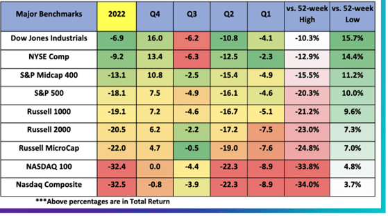 None of the major equity indices had a positive return in 2022 with the 2nd quarter showing the worst performance for the year as rising rates and increasing Federal Reserve hawkishness started getting baked into market forecasts.