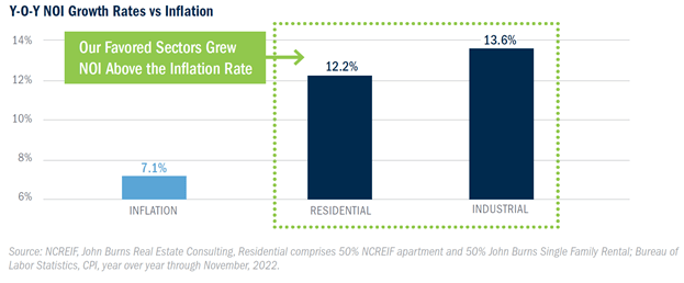 Private real estate was a top performer for 2022, particularly our favored sub-sectors of multi-family and industrial. Much of this outperformance was driven by a strong consumer, rent growth, and a fundamental undersupply of products. Sector selection and geographic locations have proven to be crucial when investing within this area. Furthermore, this was a strong opportunity set in 2022 with the dislocation seen between private and public real estate.
